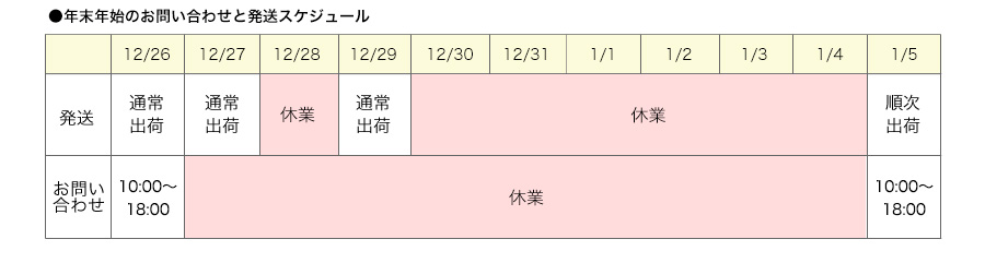 年内は12月29日(月)まで通常出荷、新年は1月5日(月)より順次出荷開始いたします。
