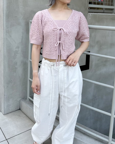 パターンメッシュフロントリボンニットカーデ+キャミアンサンブル