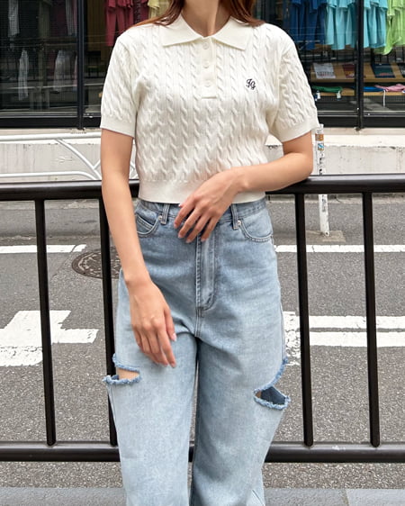 ケーブル半袖ポロニット