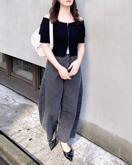 BIGカラーオフショルジップ半袖ニットカーディガン(OUTLET)