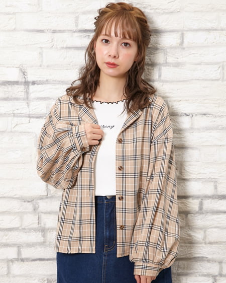 チェック柄開襟ボリュームスリーブ/シャツ