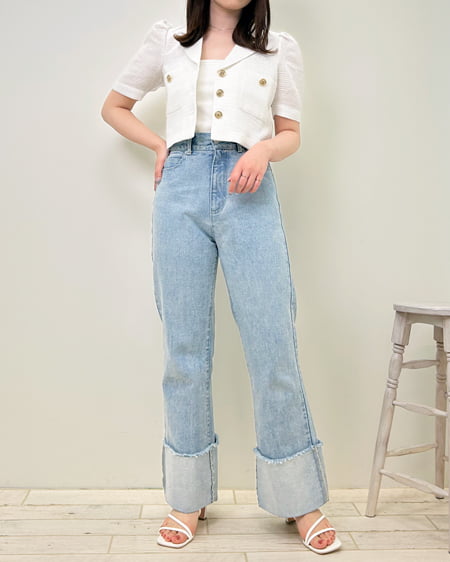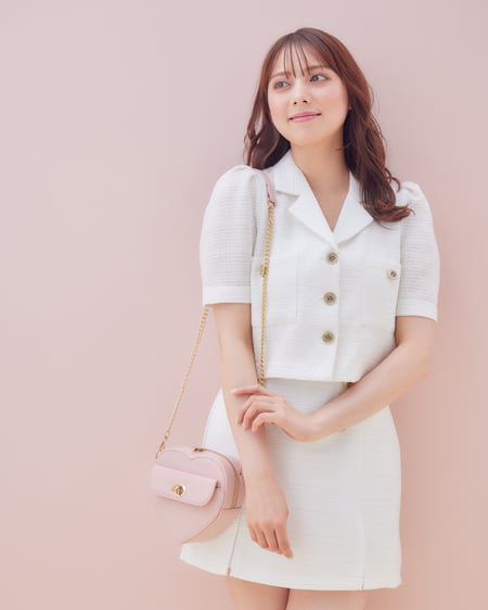 これからの季節にぴったりな半袖ジャケットはツイード素材で華やかに。