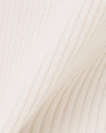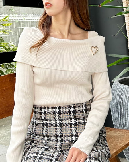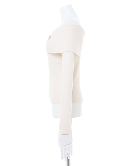 周りの目を惹くこと間違いなしの上品でフェミニンなオフショルニット。