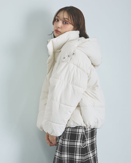 ボリューミーなシルエットと裾のアジャスターで、まんまるフォルムのエコダウンフードブルゾン。