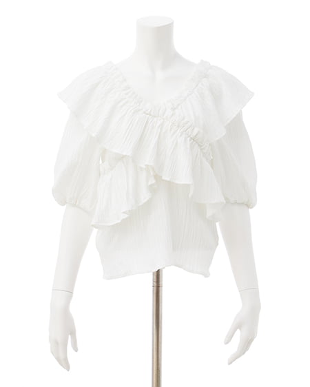 たっぷりとしたフリルとオフショルデザインでフェミニンに着こなせるブラウス。