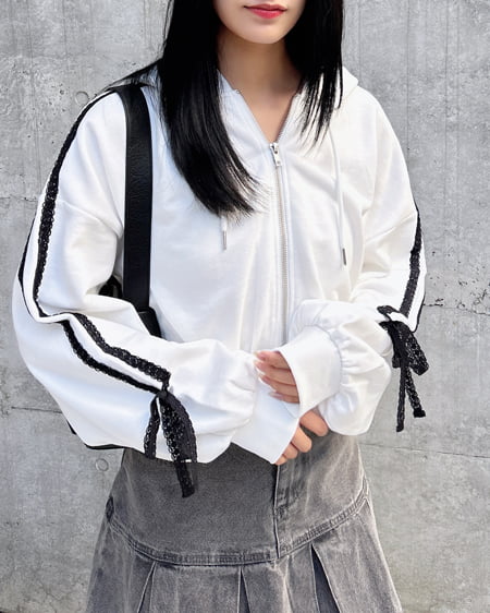 袖レースリボンショートスウェットジップパーカー(セットアップ対応)