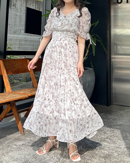 【大人かわいいディテールが詰め込まれた花柄プリーツワンピース】