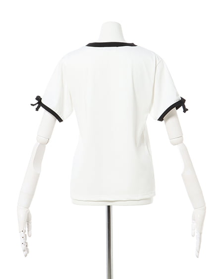 スポーティな印象のリンガーTシャツを袖のリボンでキュートに。