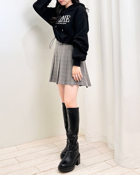 スクールガールのようなプリーツスカートは裏地がパンツデザインになっているので