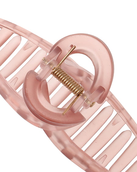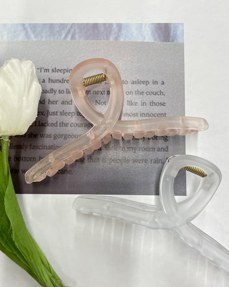 光沢を抑えたクリア素材が涼しげで大人っぽいヘアクリップ。つまみ部分のサークルデザインは付けるとリボンのように華やかな印象をプラスしてくれます。アップスタイルもしっかり留められる程よい大きさで使い勝手も◎。季節感を抑えながらも上品な印象に仕上がります。トレンドのニュアンスカラーでトレンドスタイルが完成。
