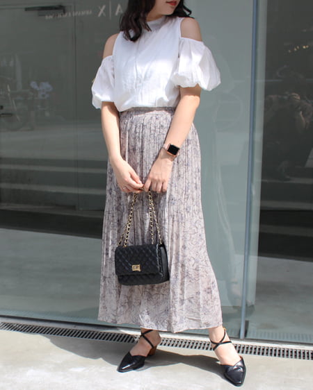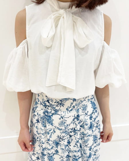 肩開きとバルーンスリーブで華奢見え効果抜群ですが、ブラウス自体はハイネック仕様でキレイな肌見せコーデを楽しめます。リボンは前後2way仕様なので合わせるアイテムによって雰囲気を変えられるのも嬉しいポイント。レーヨン混の素材で伸縮性には少し欠けますが、涼しくお召し頂ける1枚になっております。