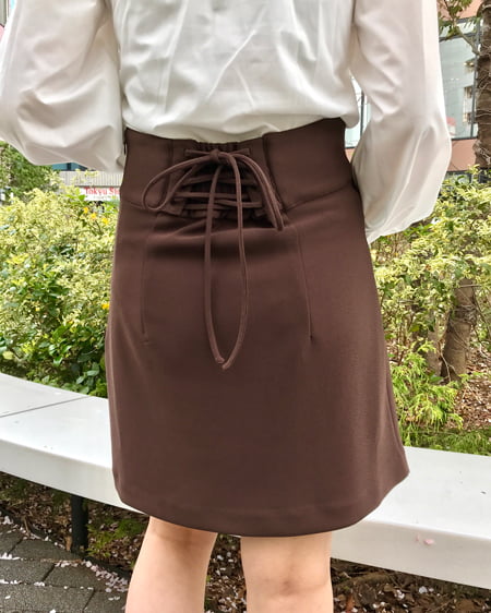 バックのレースアップデザインで後ろ姿をキュートに演出するミニスカート。