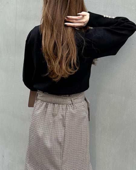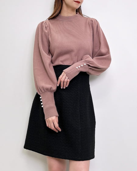 ボリュームのあるふんわりスリーブと袖口のパールビジューが大人フェミニンなニットトップス。