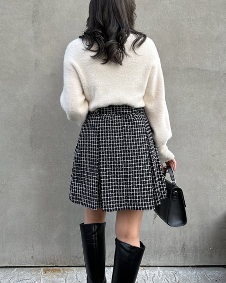 ・【1224-300394 共ベルト付ツイードBOXプリーツミニスカート】【1224-300461 裾切替ミニフレアスカート】などのミニスカートでデートにもおすすめのガーリーコーデに。
