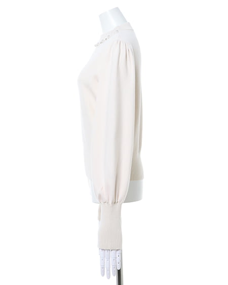 襟元にビジューをあしらったアクセいらずのニットトップス。