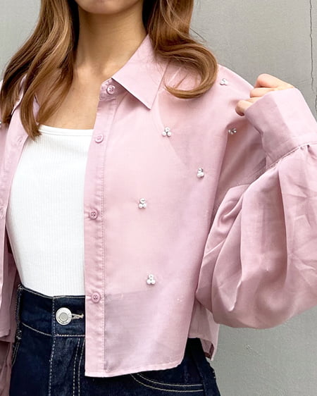 全体にビジューが散りばめられた華やかなシアー素材のショート丈シャツ。