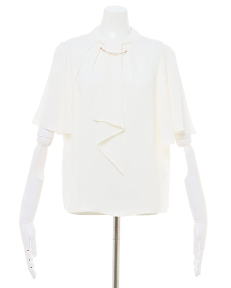クラシカルな雰囲気のパールビジューピン付きボウタイブラウス。
