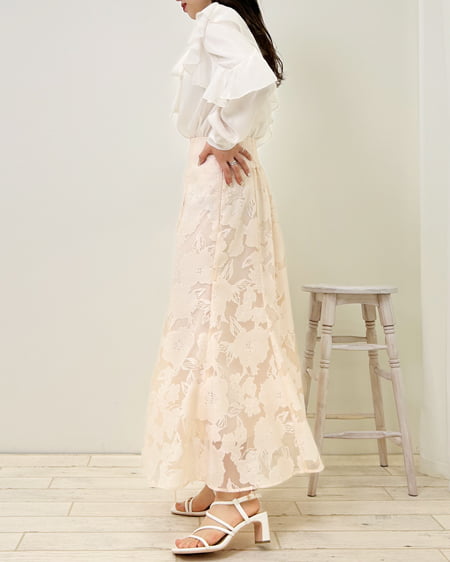・総柄レースの透け感がエレガントな、女性らしいロングスカートです。