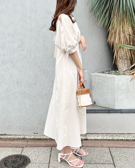 バックにあしらったリボンと、ヘルシーな肌見せが女性らしい印象です。