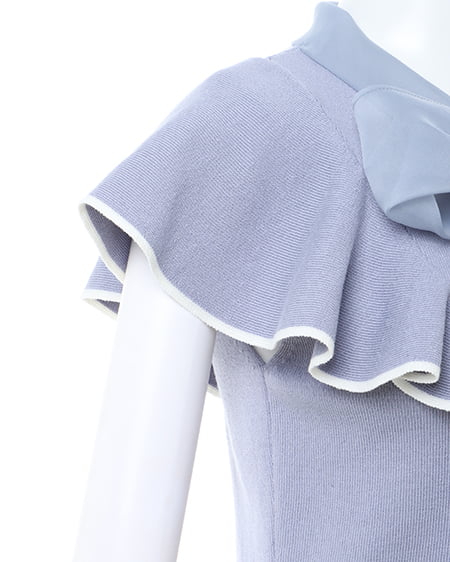 斜めに入ったフリルは肩や二の腕をカバーし、さらに顔周りを華やかな印象に。