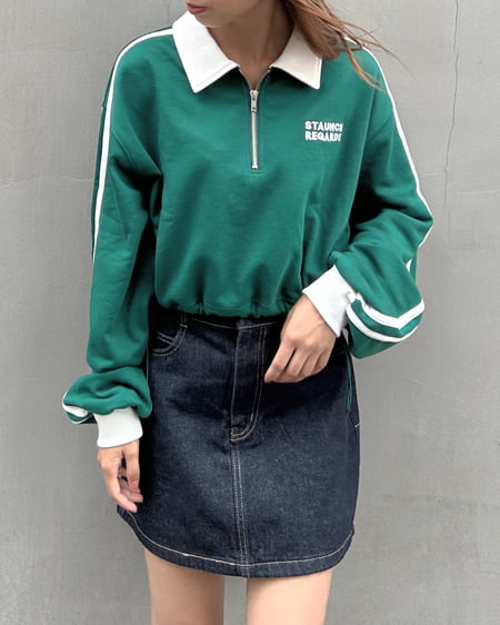 ハーフZIP裾ドロスト配色袖ラインショートトップス