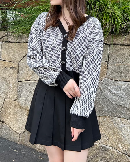 カーディガンはふんわりとボリュームを持たせたスリーブがフェミニン。