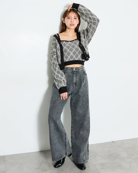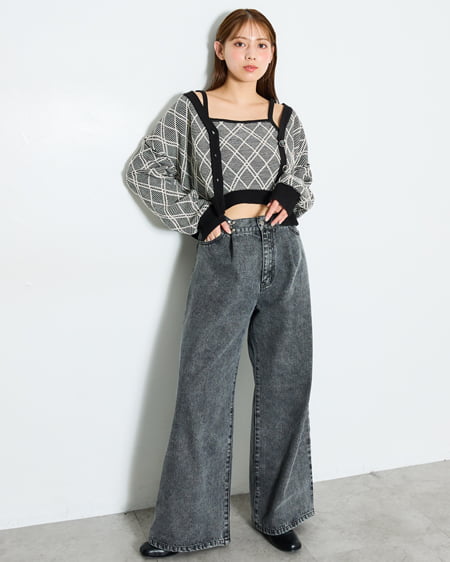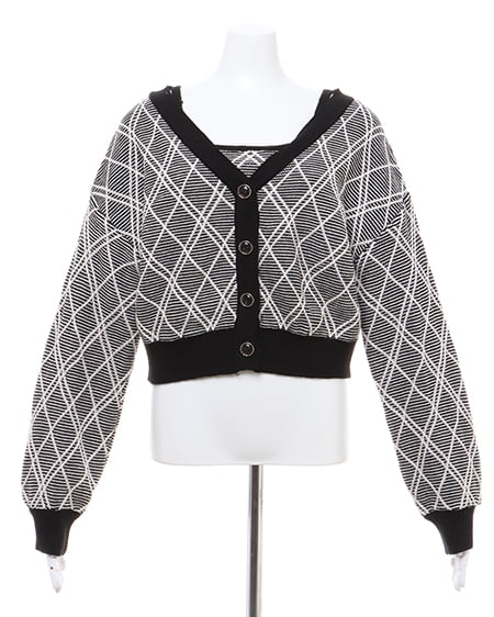 立体感のあるチェックを編地で表現したカーディガンとキャミソールのセット。