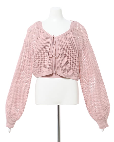 透け感のあるメッシュニットカーディガンはフロントのリボンがキュート。