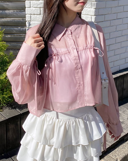 ラメ感のある生地と、袖と胸元のリボンデザインで立体感のあるシアーシャツ◎