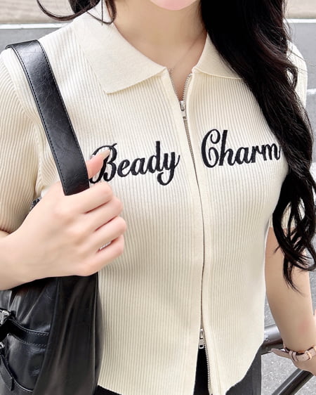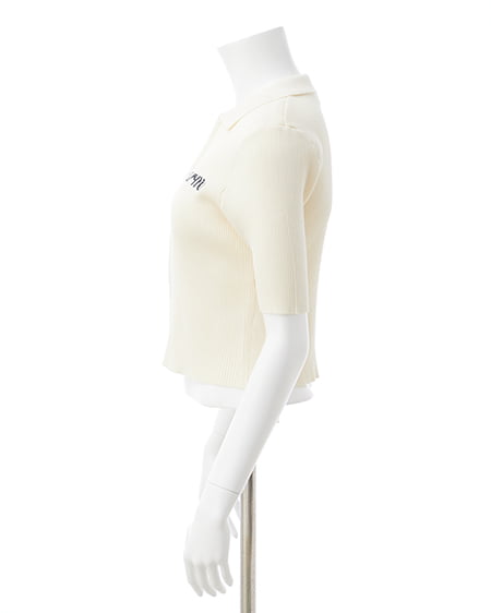 襟付フロントロゴ刺繍半袖ジップニットカーディガン