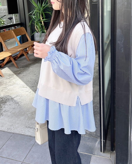 ロング丈のシャツにニットを重ね着したようなドッキングデザインが◎。