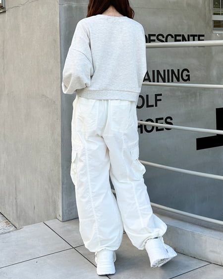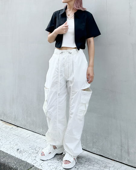 ・シャリ感のあるナイロンの生地で仕立てたカーゴパンツです。