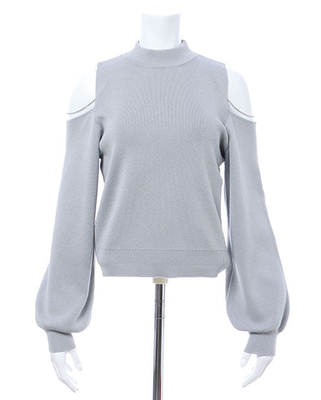 肩のオープン部分に取り外し可能なチェーンを付け、華やかなアクセントにしています。