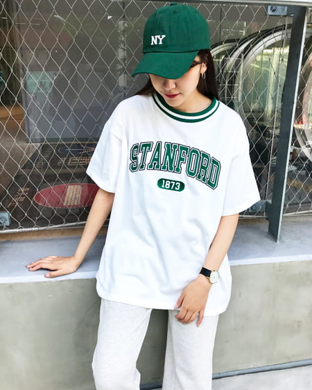 フロントの刺繍ロゴと首元の配色ラインが印象的なTシャツ。