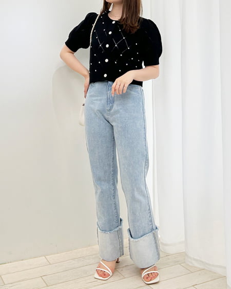 ・輝くラインストーンとビジューボタンがアクセントの、華やかな主役級アイテム。