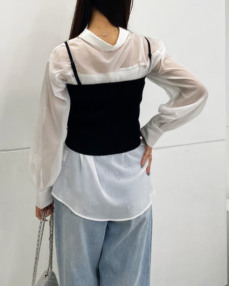 ビッグシルエットのシアーシャツとコンパクトなニットビスチェのセットです。