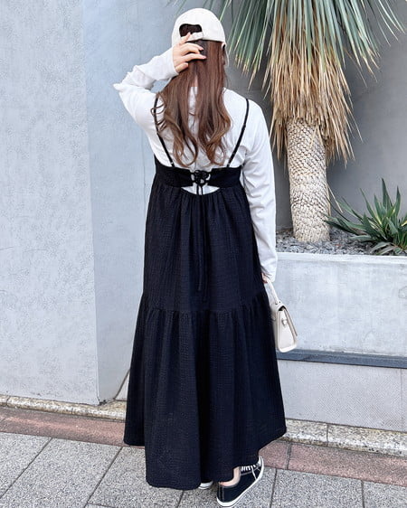 主役級のキャミソールワンピースなので、インナーにはシンプルなカットソー合わせがオススメです。
