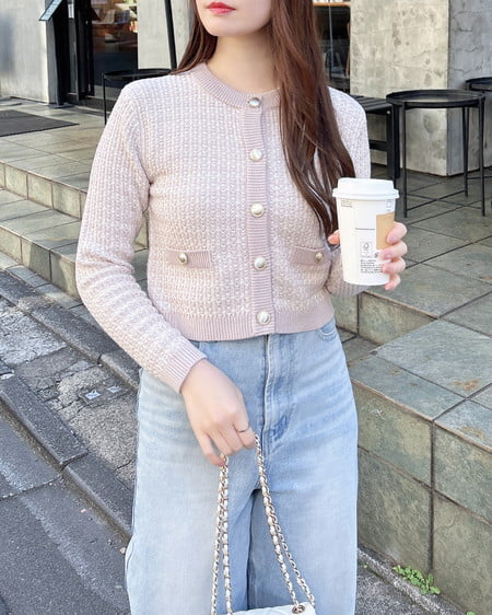 ツイード調に編みこまれた珍しい編地が高見えポイント。