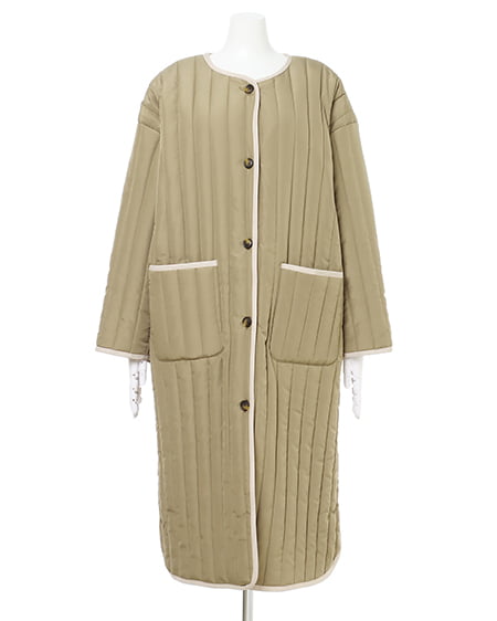 キルティングなので暖かく、すとんとしたシルエットがスタイルアップに役立ちます。 パンツはもちろん、オーバーサイズの作りなのでスカートもシルエットを選ばす合わせやすいです。 配色パイピングがコーデのポイントになります。