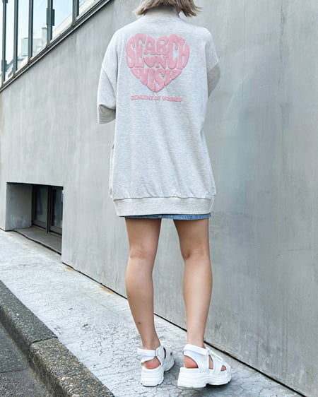 バックにあしらったハート型の大きな立体ロゴがキュートなハーフジップトップス。