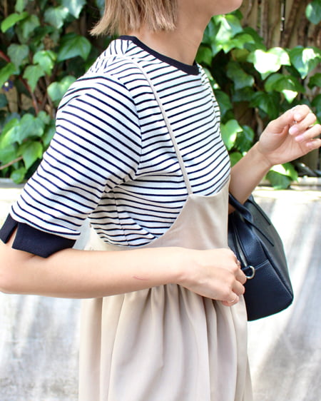 華奢なショルダーストラップでTシャツやブラウスにも合わせやすく、大人っぽく着られます。