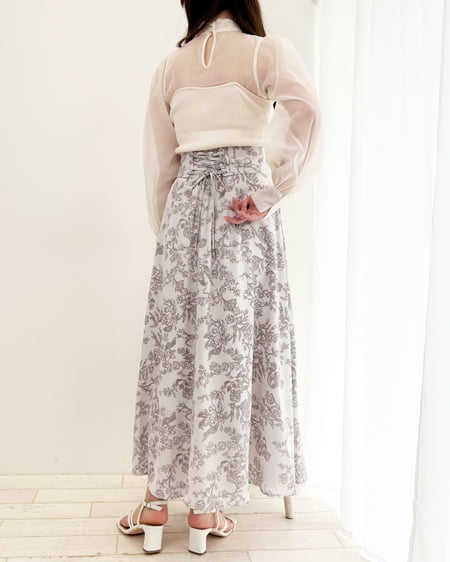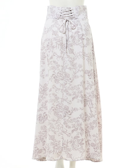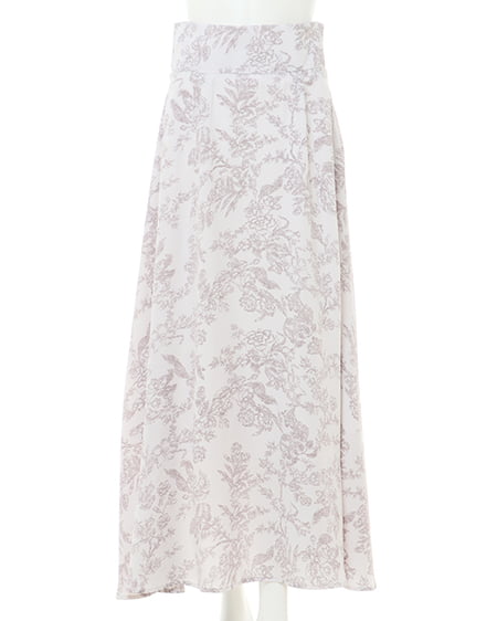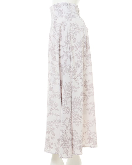 フランスの伝統的なデザインのトワルドジュイ柄の生地で仕立てたフレアスカート。