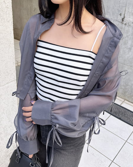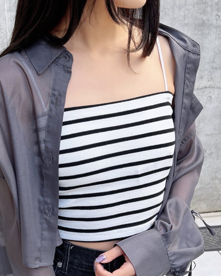 ボディラインにフィットするリブと細ゴムのショルダーストラップが華奢見えを叶えます。