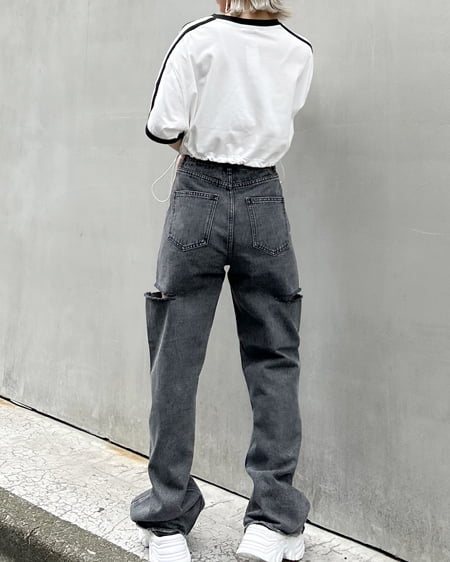 裾ドロスト胸ロゴ袖ラインリンガーTシャツ
