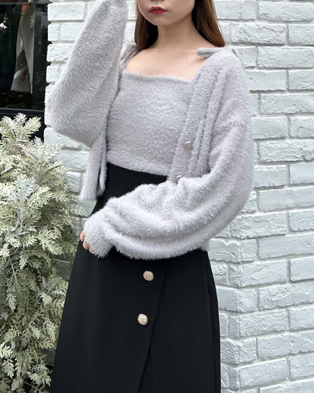 【セットアイテム】フェザーショート丈ニットカーディガン+肩リボンキャミSET