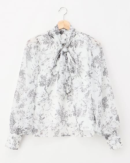 ラメシアー花柄ボウタイブラウス