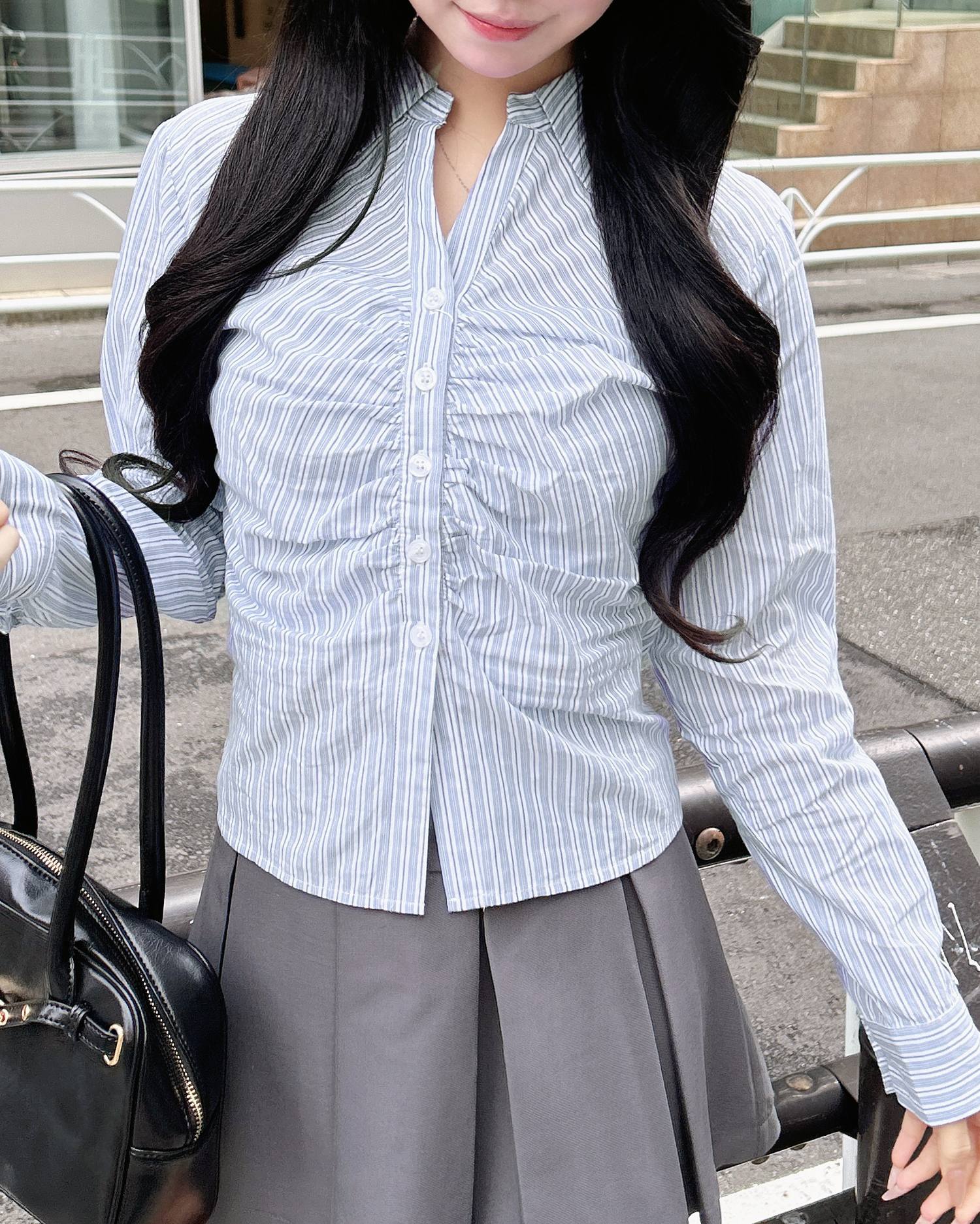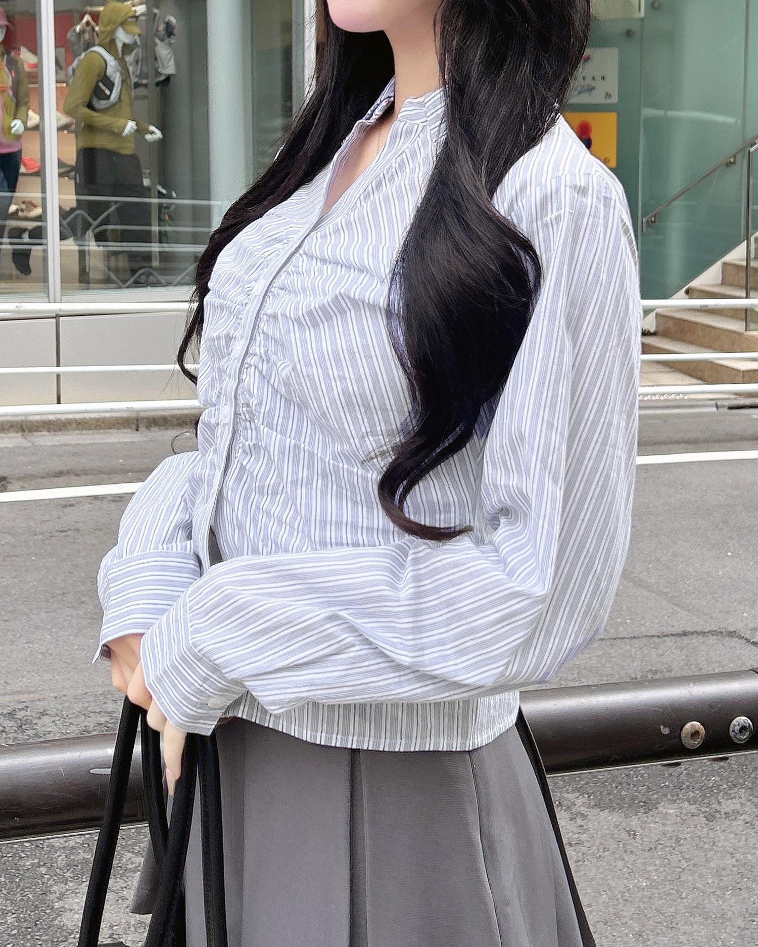 胸元のギャザーでメリハリシルエットに仕上げたシャツ。