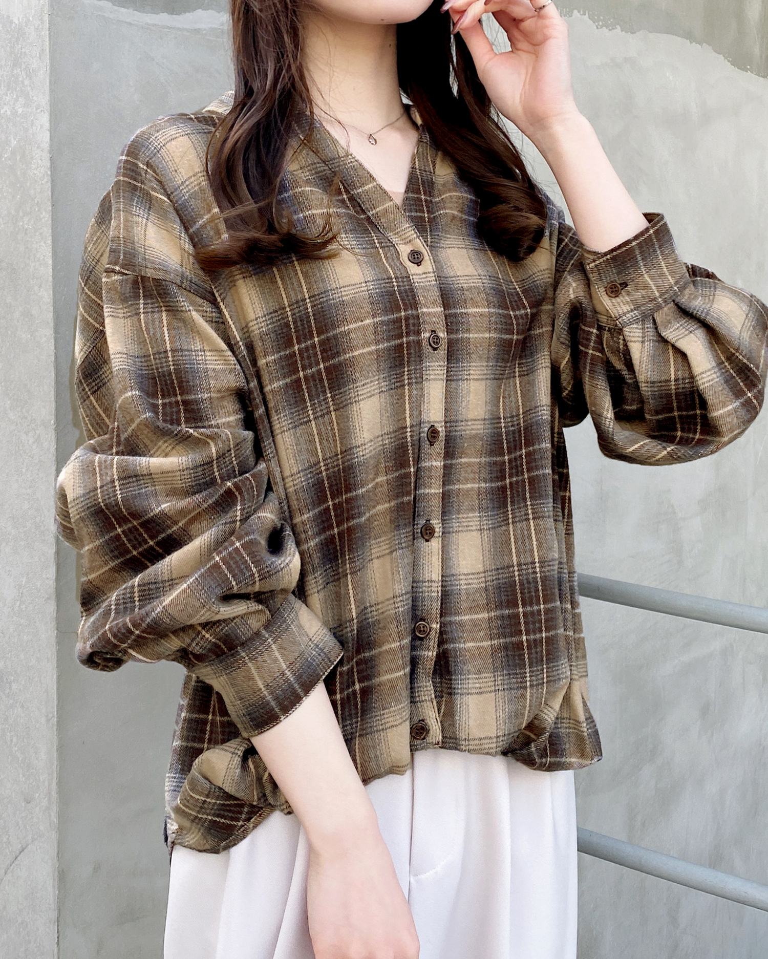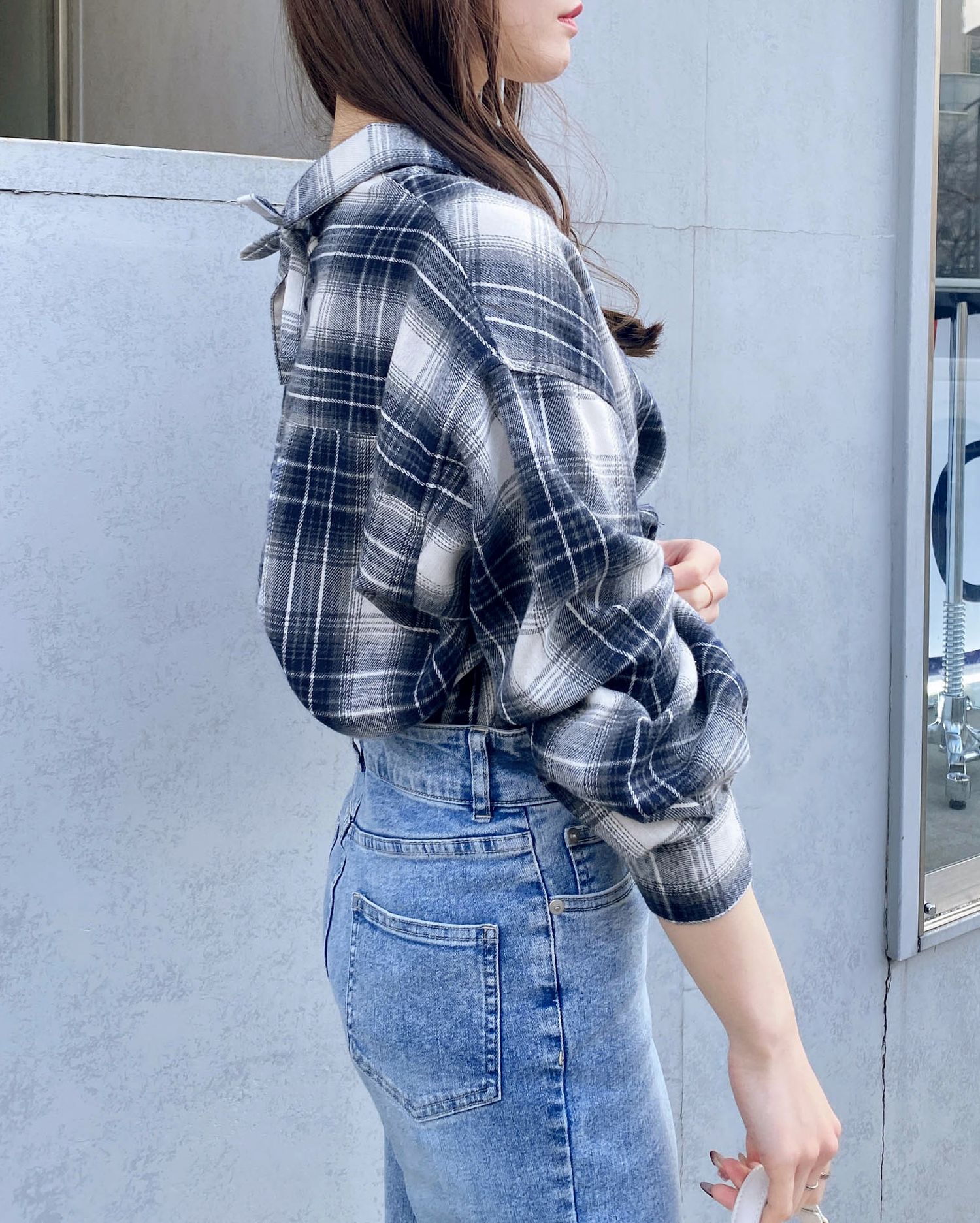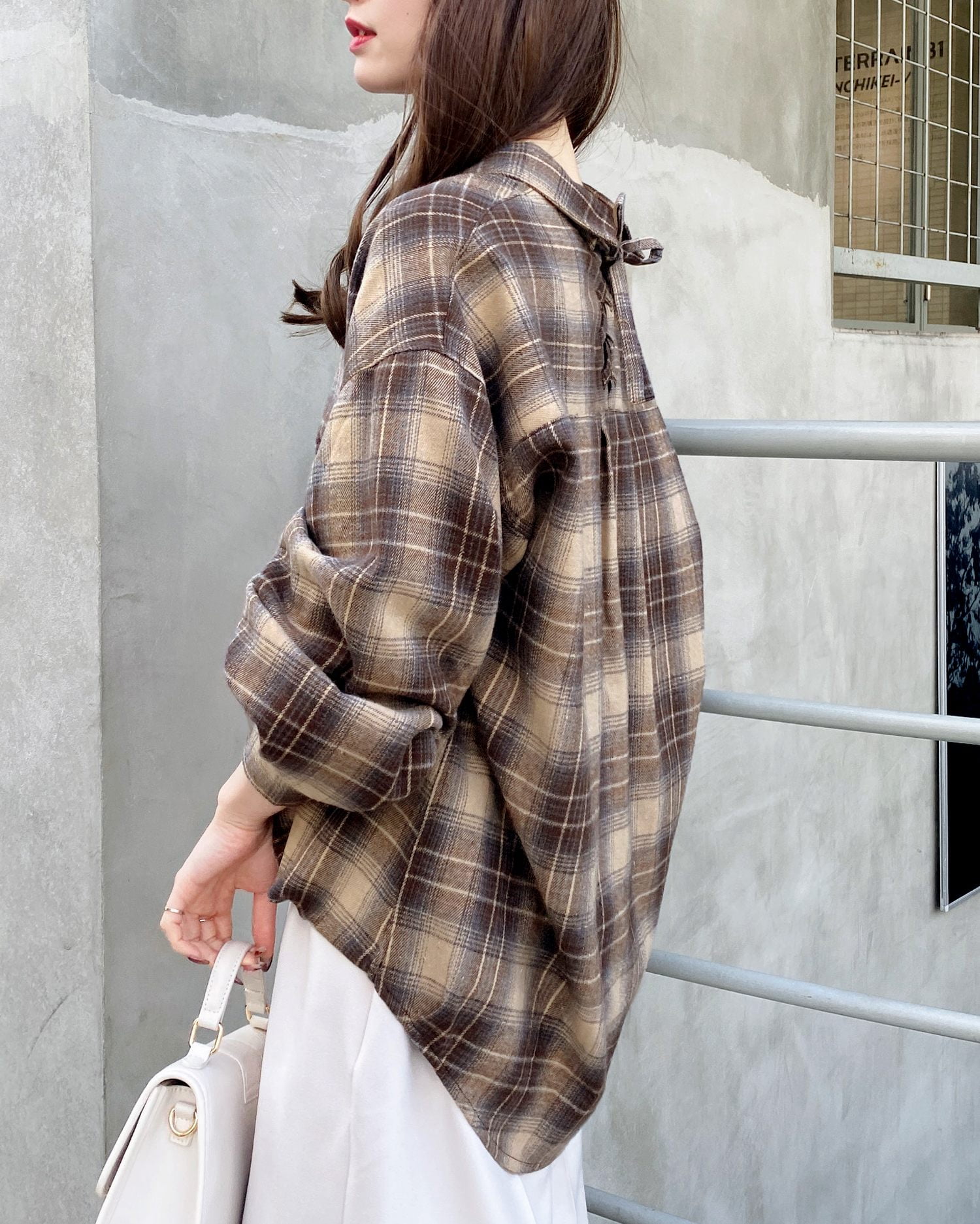 バックのレースアップデザインが抜け感を演出するチェック柄シャツ。