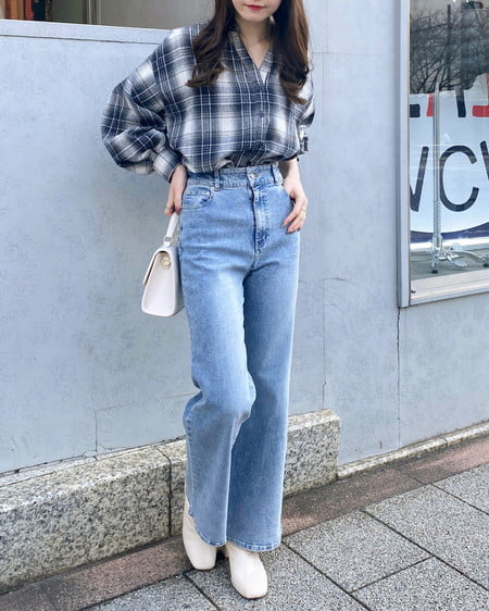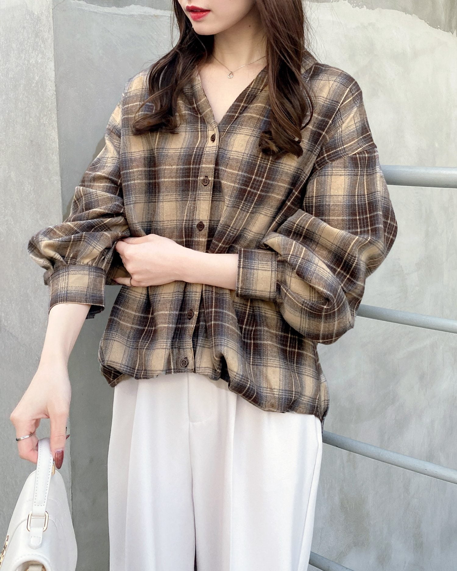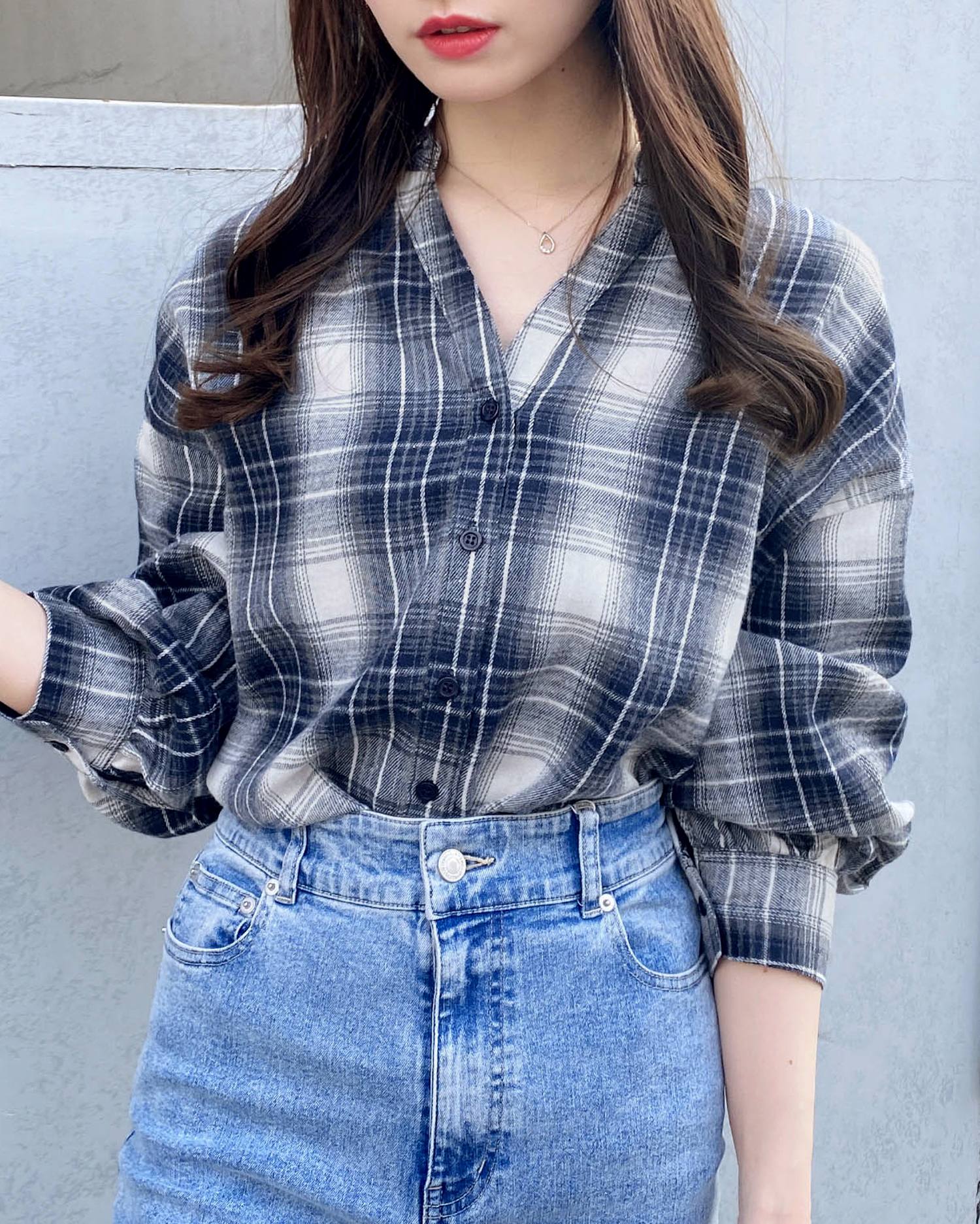 バックのレースアップデザインが抜け感を演出するチェック柄シャツ。