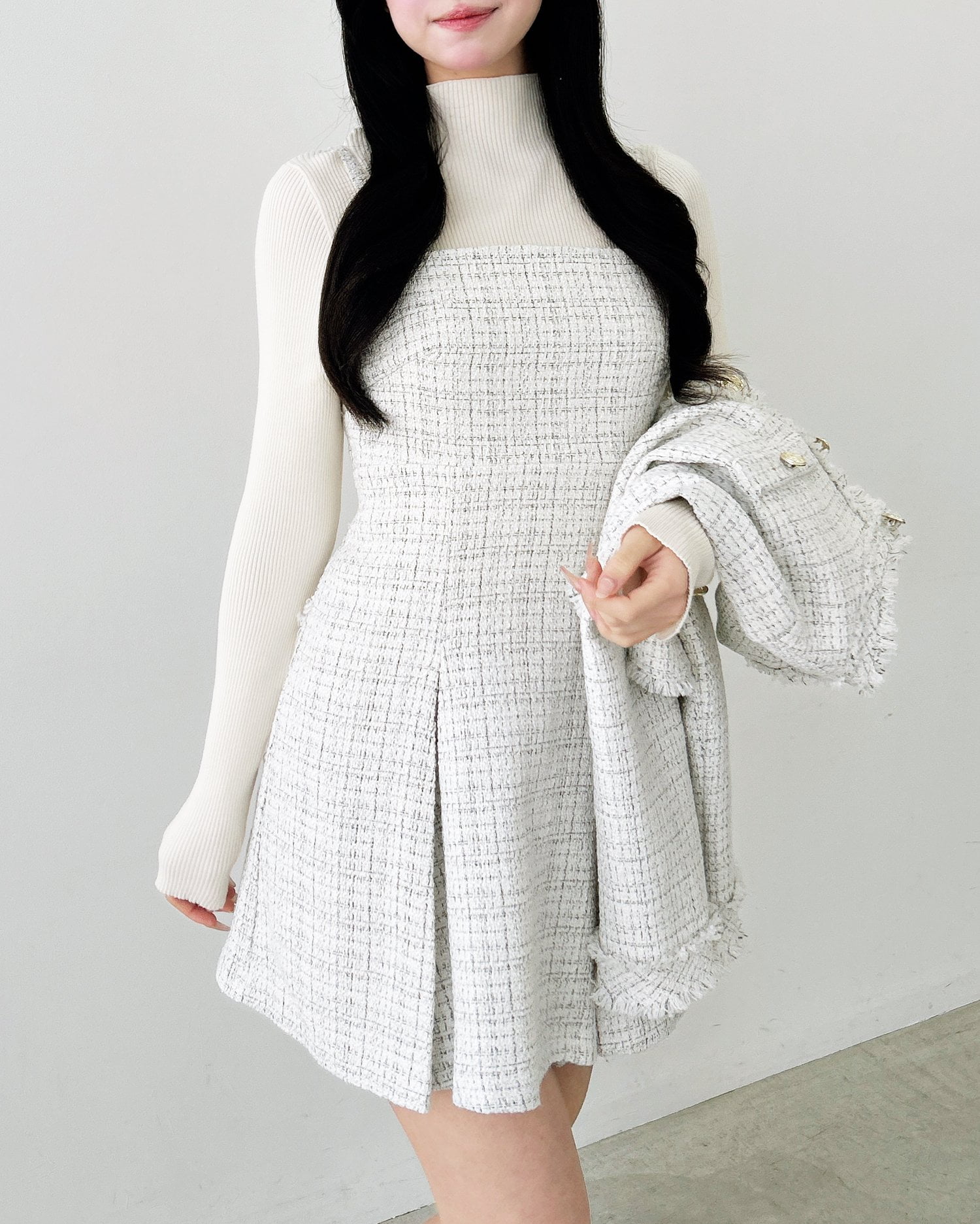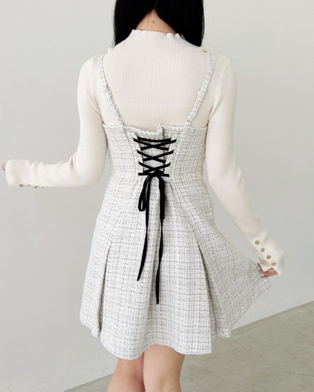 大人っぽく着られるツイード素材のミニ丈ワンピース。